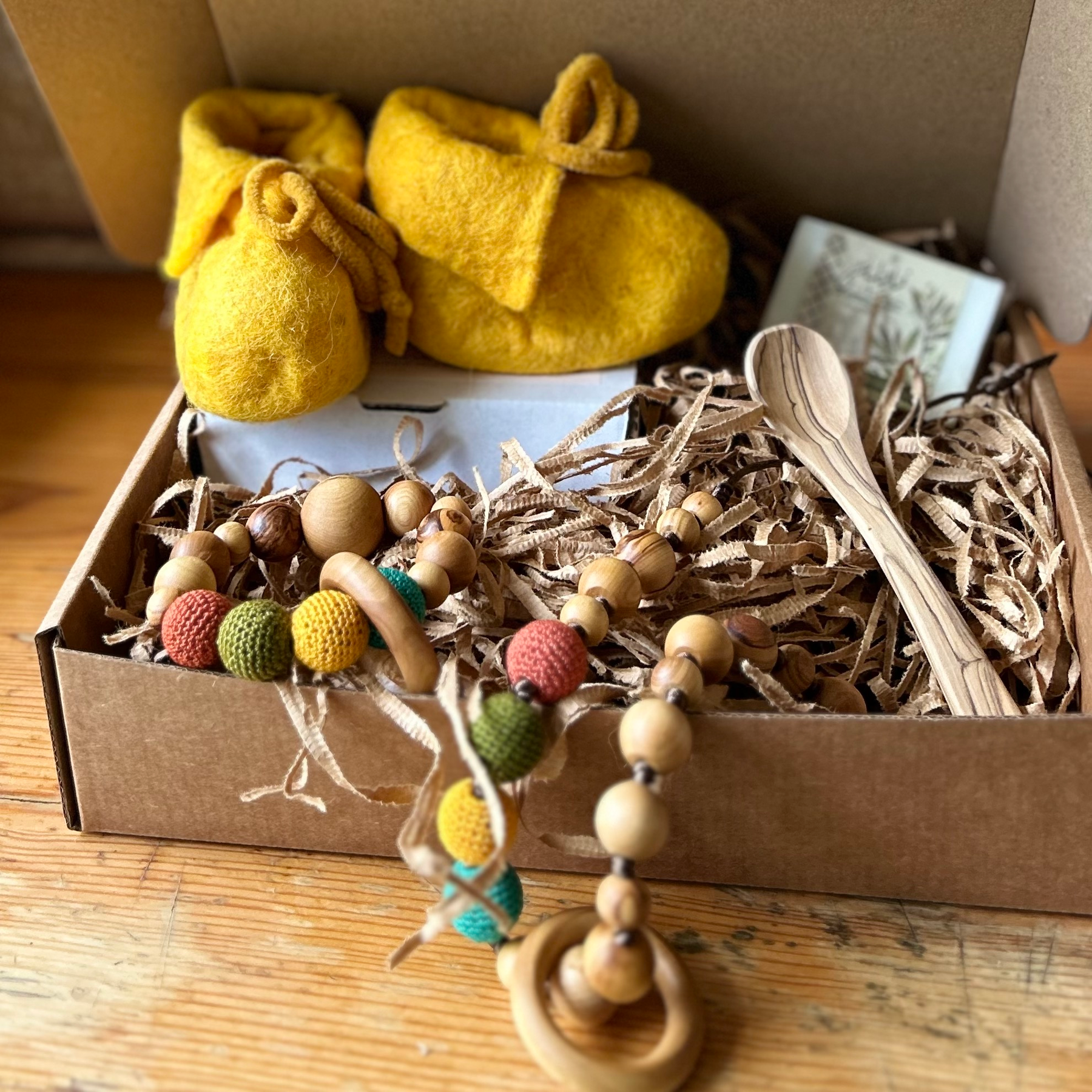 All Natural Baby Shower Gift Bundle | Hand Crafted Teething Ring & Baby Booties