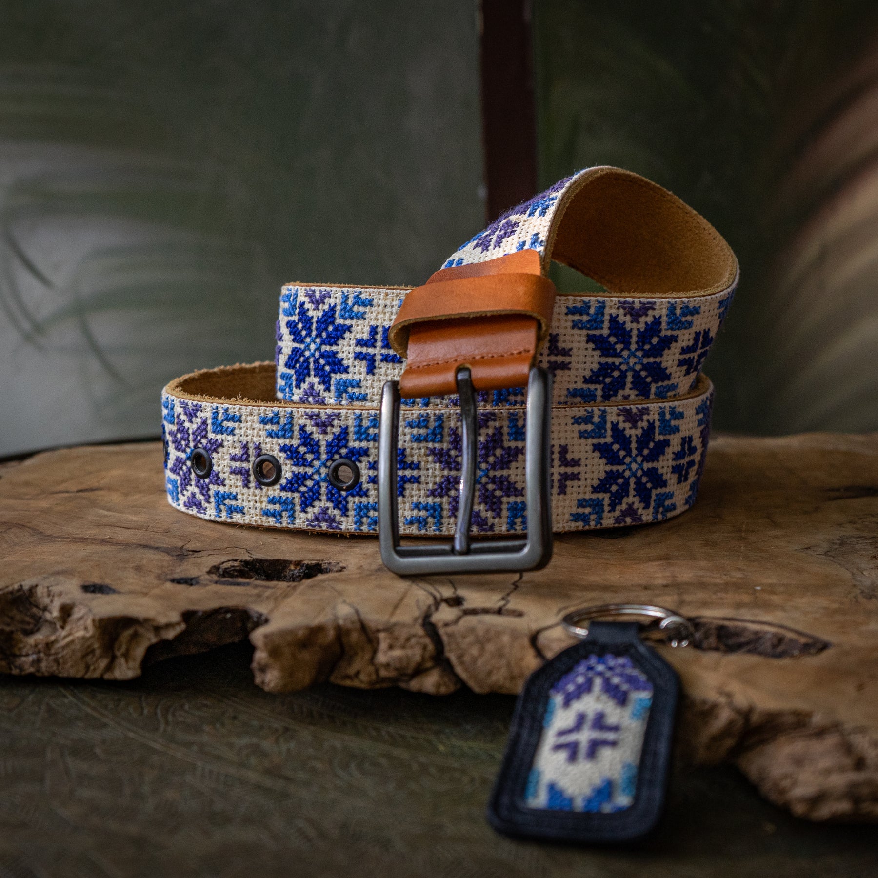 These belts feature hand embroidered, a traditional art in Palestine, called tatreez and are crafted on genuine leather, lovingly made by multiple artisans' hands.