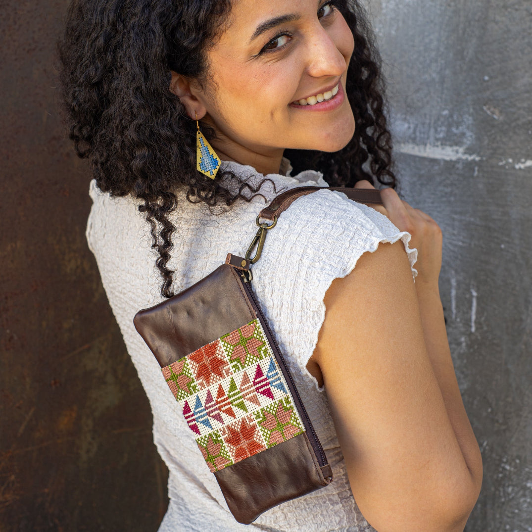 This three in one leather clutch and fanny pack is a great travel bag and can be worn in multiple ways. It features hand crafted Palestinian tatreez on leather and is crafted in Hebron, the heart of Palestine's leather industry. Each bag comes with a short clutch strap and waist strap.