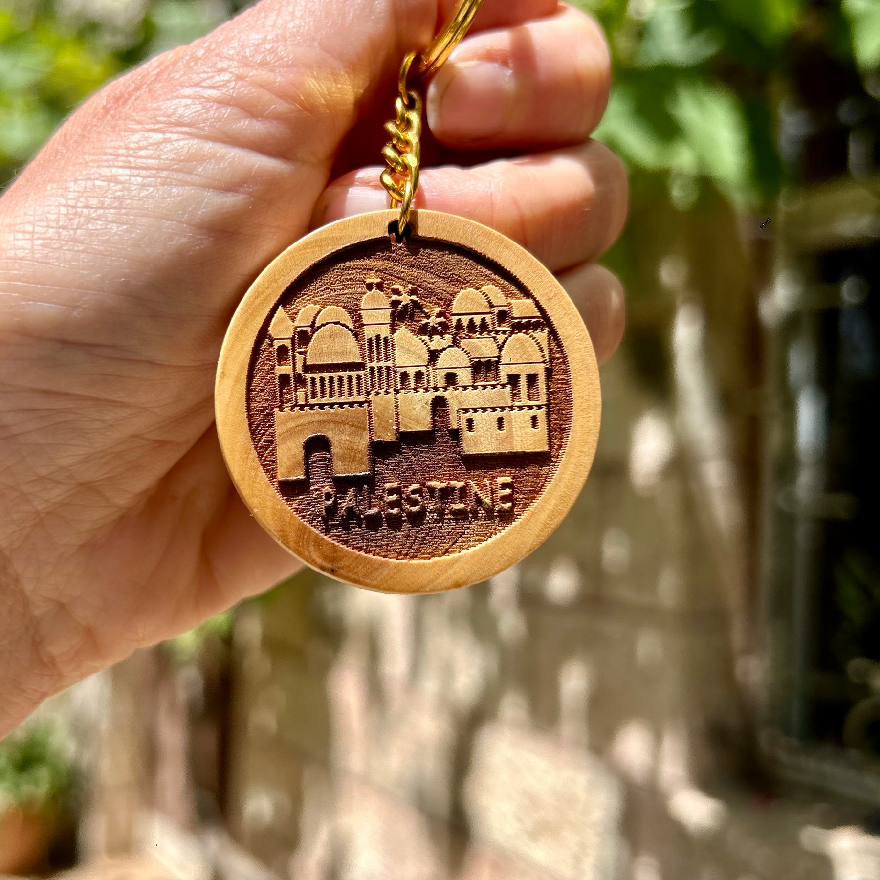 Landscape of Jerusalem's Old City Keychain in Olive Wood | Hand Carved from Bethlehem