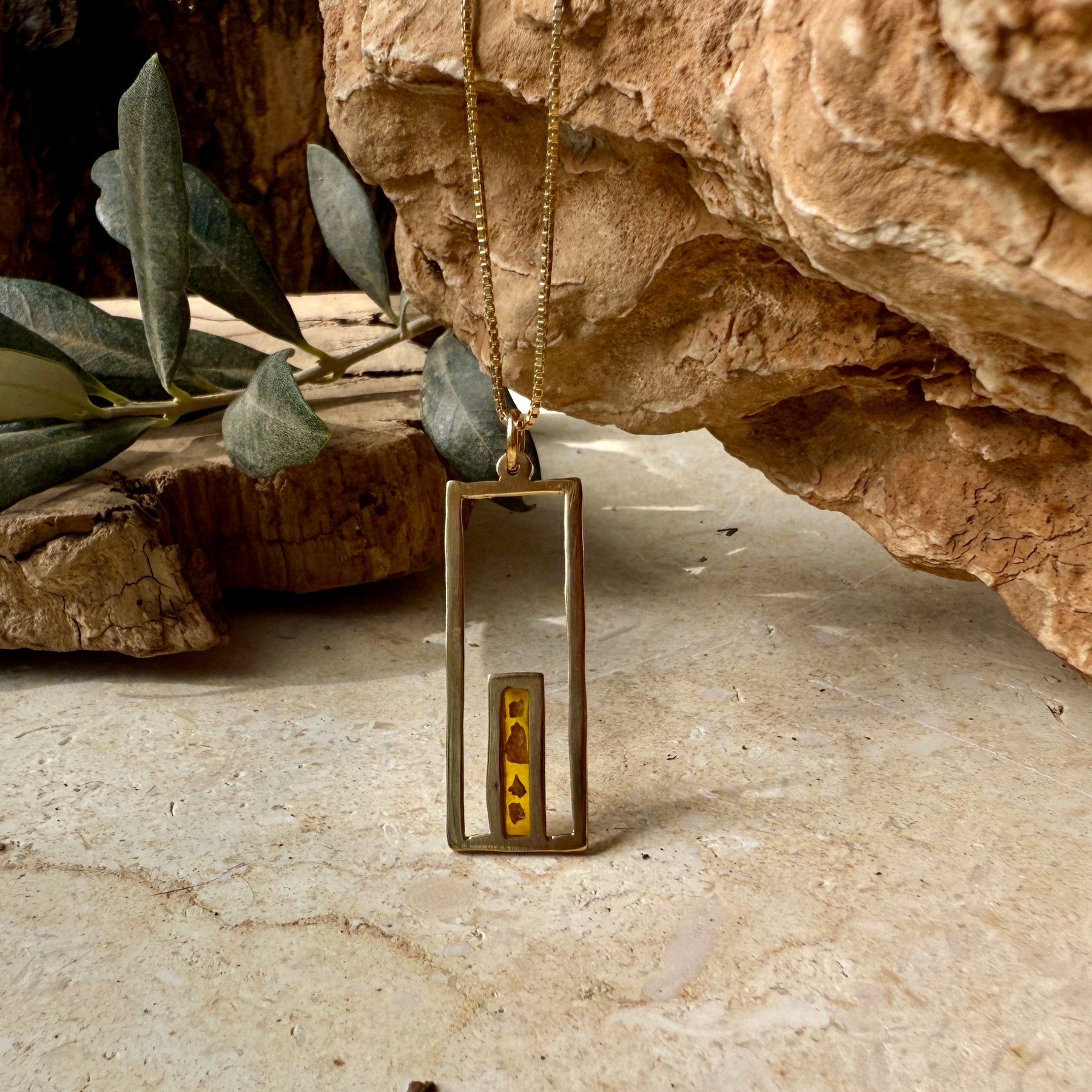 The necklace is shaped to represent the gate to the Old City of Jerusalem, Palestine, and features tiny pieces of stones from Palestinian cities held inside with amber colored resin.