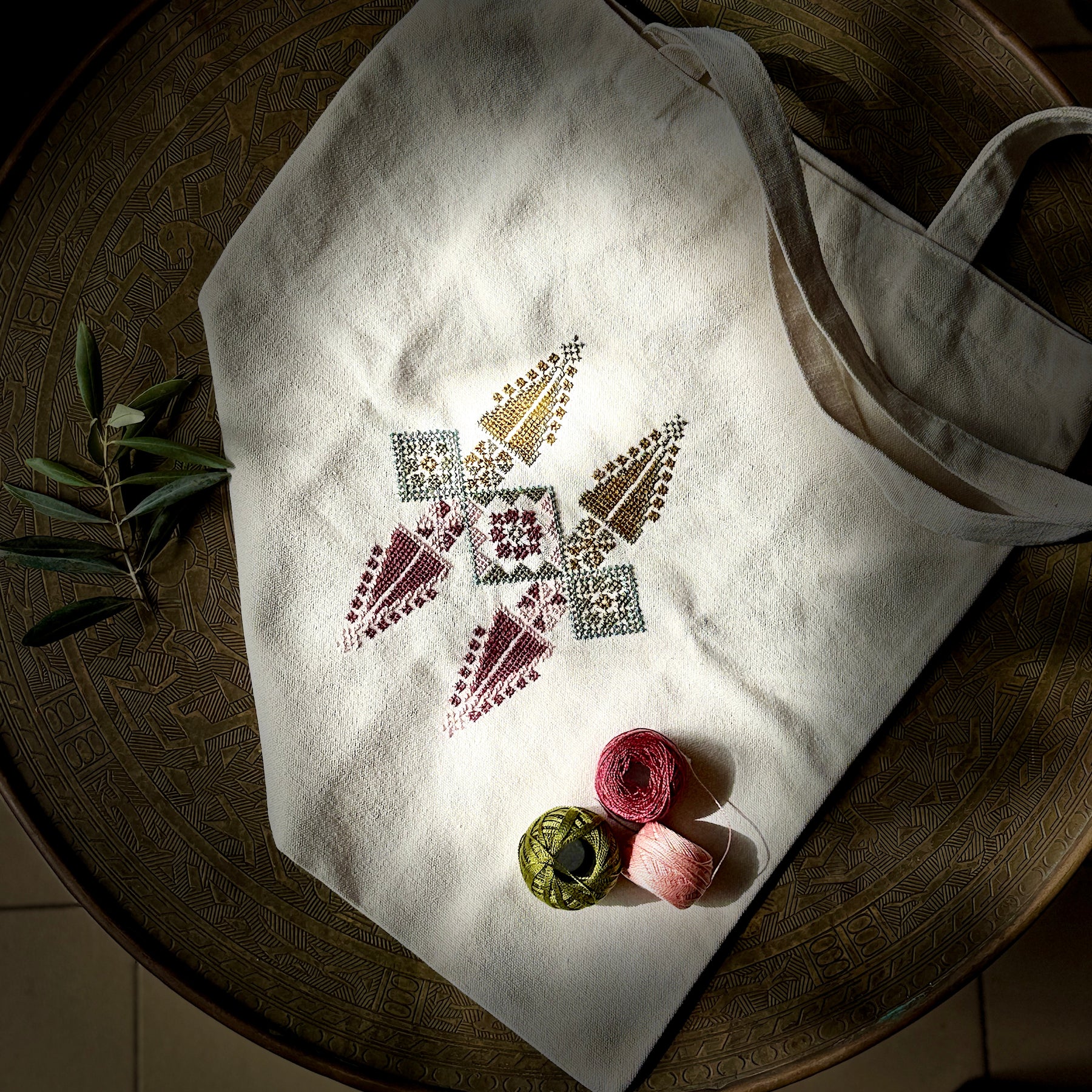 This beige fabric tote was hand embroidered by women artisans carrying on the traditional craft of tatreez.