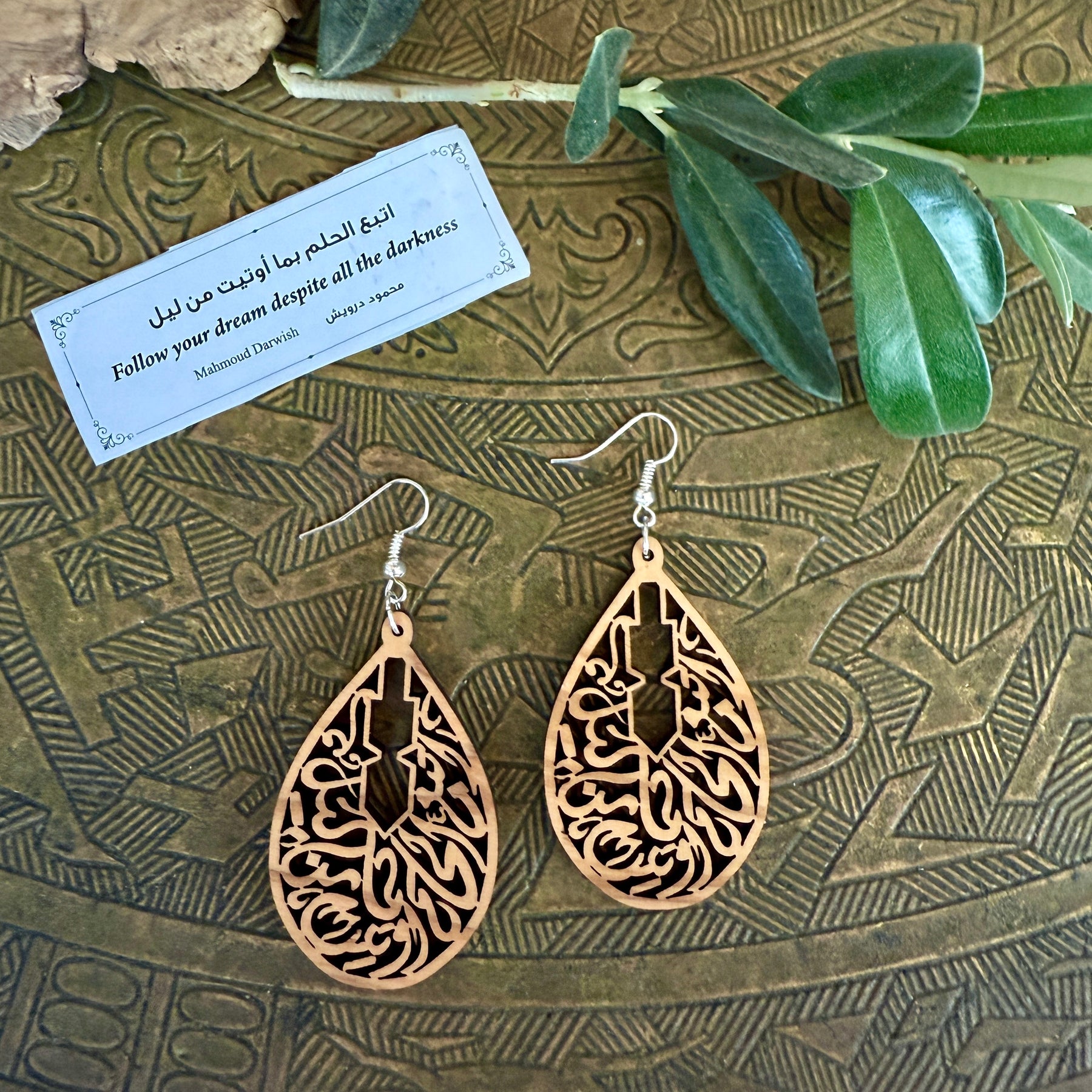 Darwish Quote in Arabic Calligraphy on Olive Wood Earrings | Handmade from Palestine