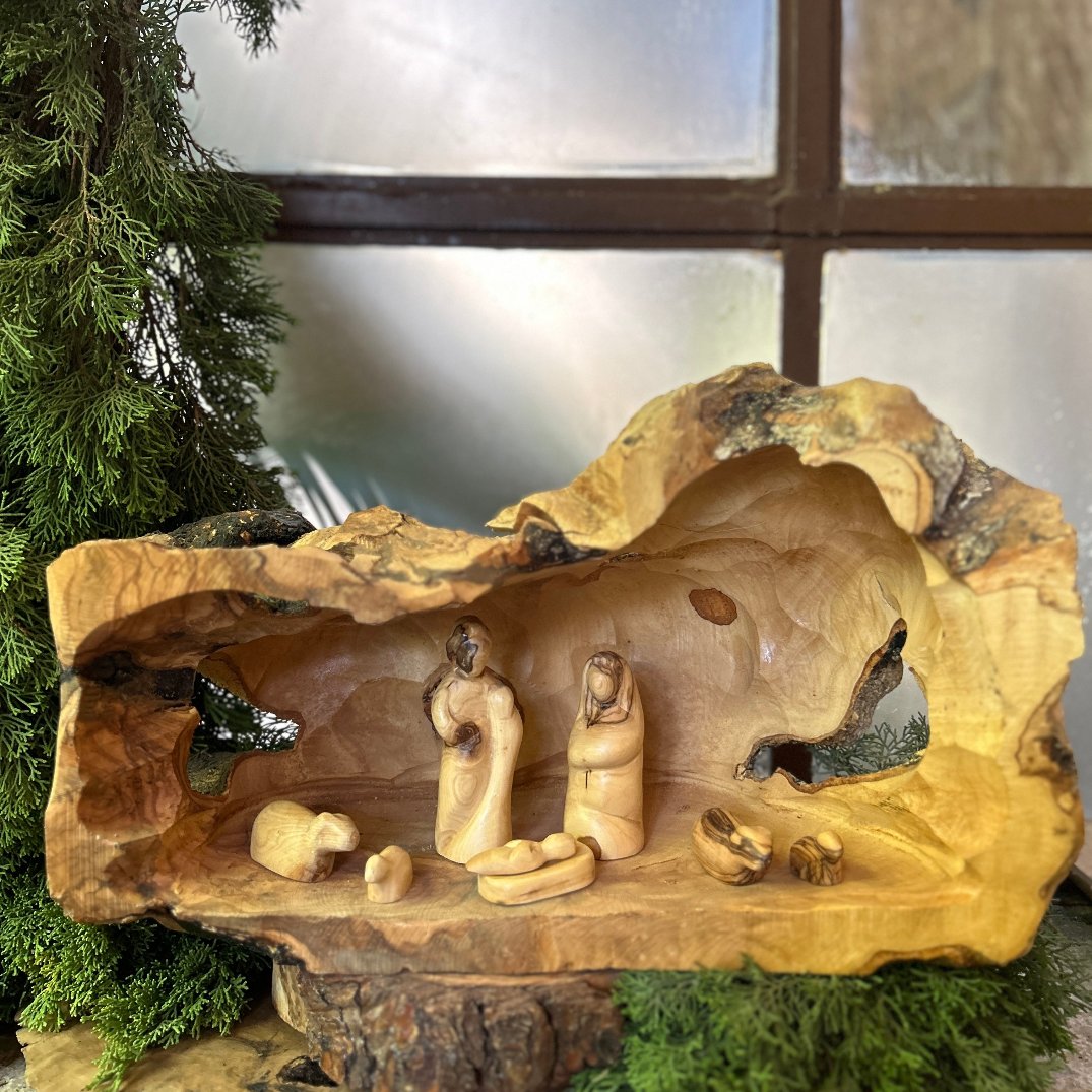 This stunning olive wood nativity set features 11 hand-carved figurines from Bethlehem, each carefully sculpted to reflect the sacred story of the Holy Land.  The natural beauty and grain of the wood enhance the set's authenticity, with each grotto uniquely shaped by the tree's natural form.