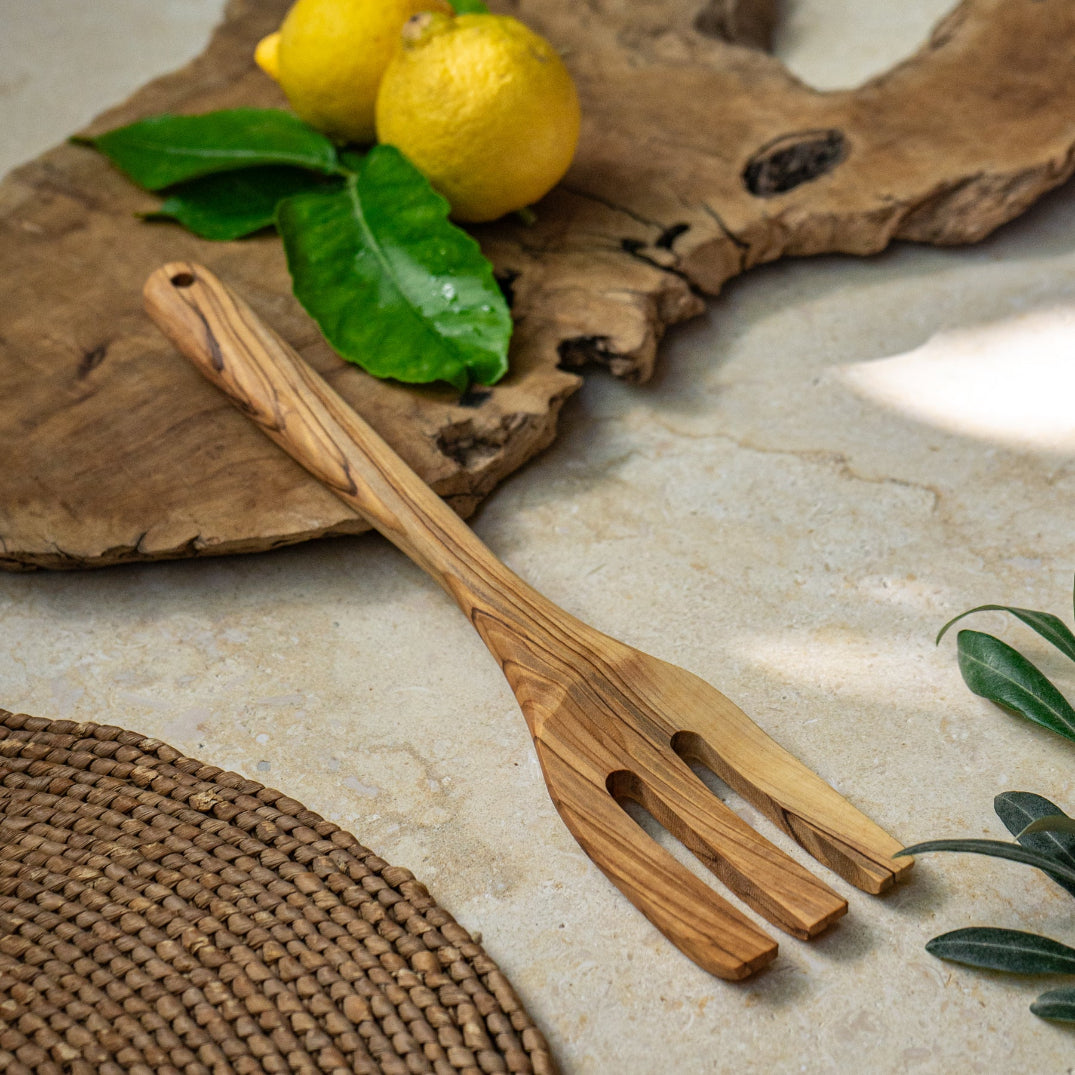 Made in Bethlehem by skilled artisans, this fork is crafted from pruned olive trees, ensuring sustainability and a connection to traditional craftsmanship passed down through generations.