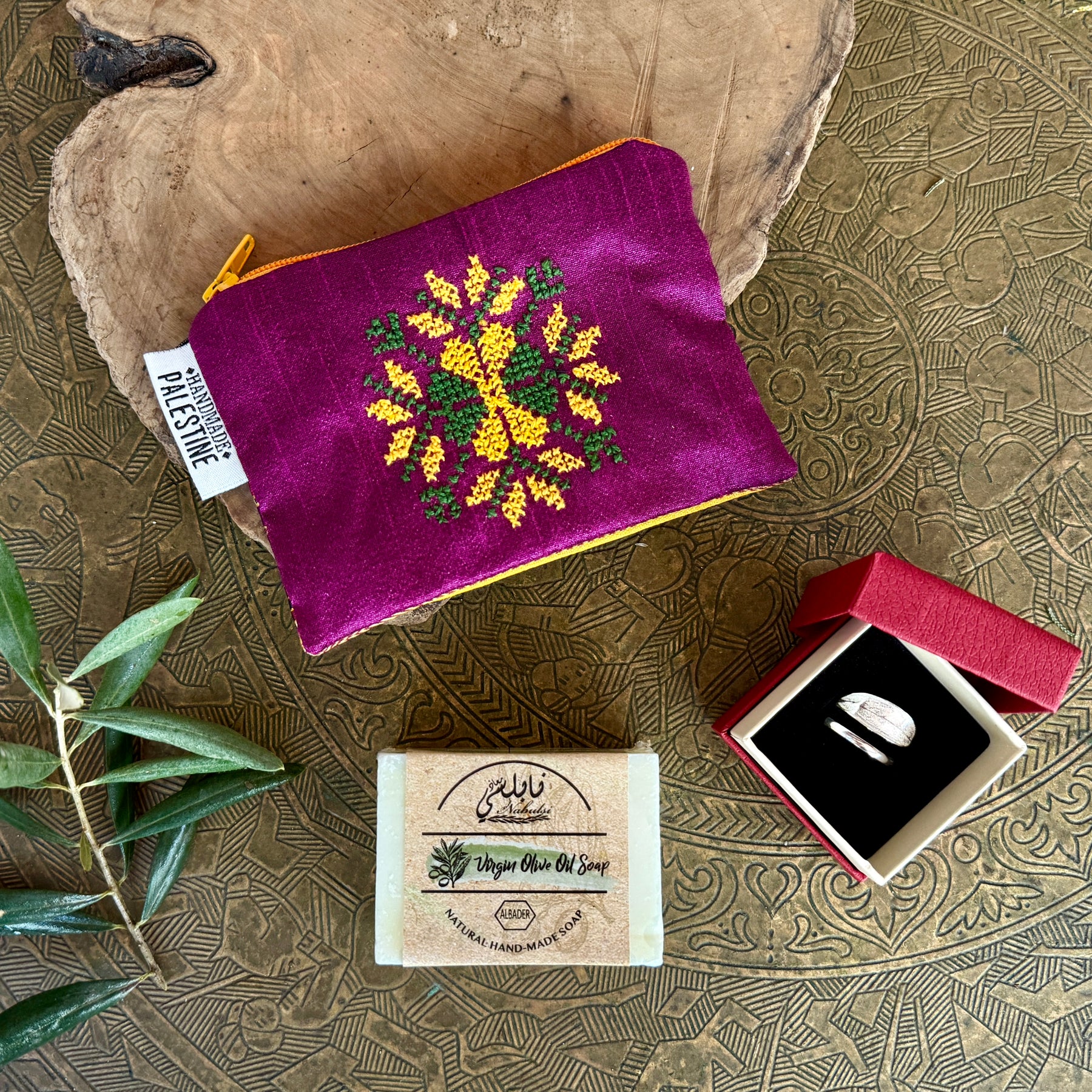 Included are a waste thread coin purse in mulberry with tatreez, traditional Nabulsi olive oil soap bar, and a hand crafted sterling silver ring that is one of a kind from an ancient olive tree in Bethlehem.