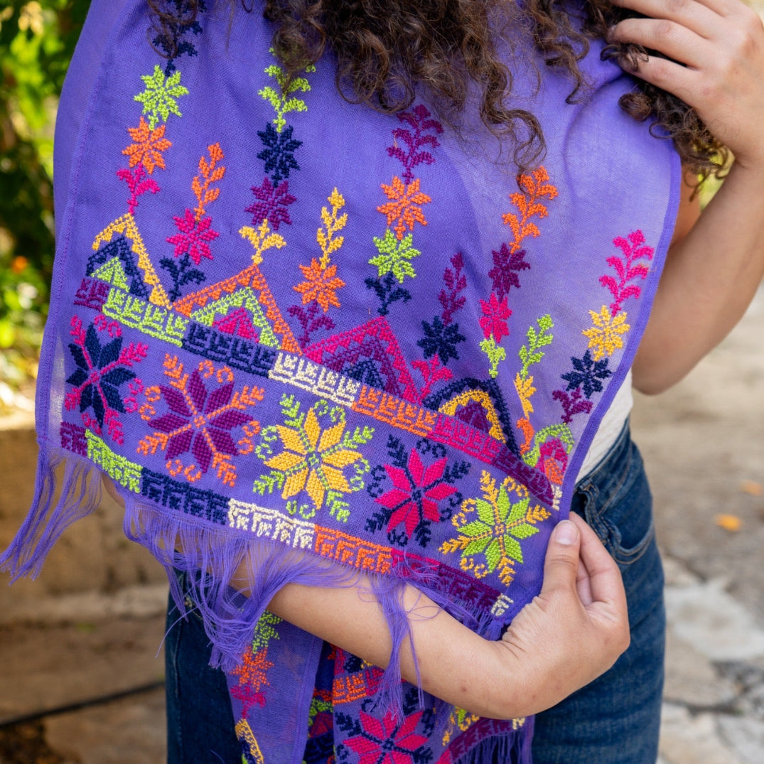 This stunning scarf in lilac najaf fabric, which is an elegant, thin material almost like gauze, is incredibly challenging to embroider and few women still possess this skill level today in Palestine. The vibrant embroidery from women in Palestinian villages working from home is a skill passed on, the craft of traditional Palestinian tatreez.