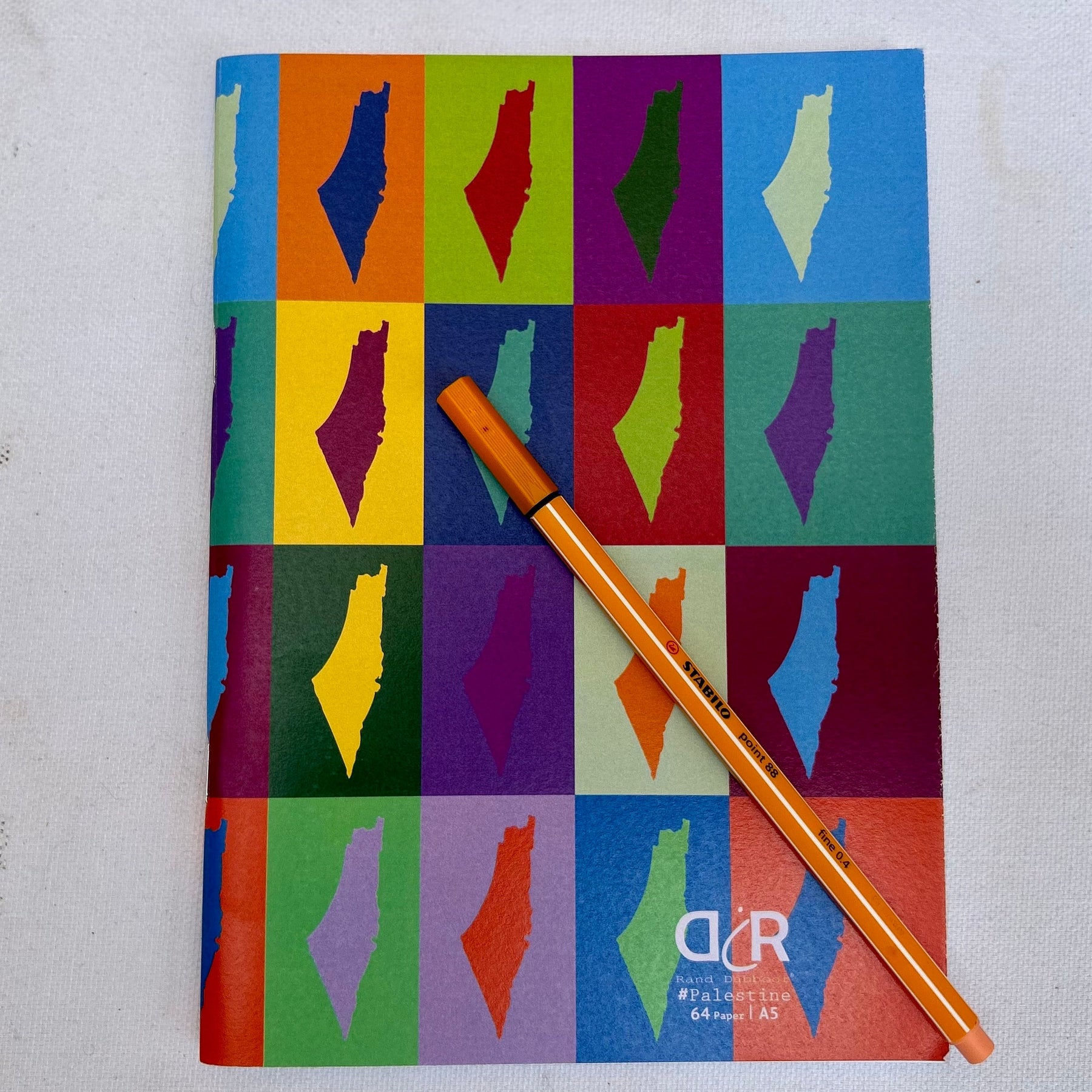This A5 notebook, designed by Rand Dabboor, features a colorful and modern representation of the map of Palestine, reflecting a bold cultural statement.  Printed in Palestine, it's the perfect notebook for those who want to combine practicality with a meaningful connection to Palestinian heritage.