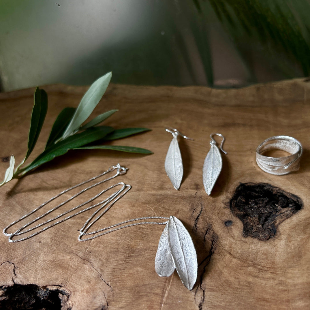 This gift set is so unique, and gorgeous, because no two leaves are alike! The set includes a handcrafted sterling silver necklace, earrings and ring made from unique molds of ancient olive tree leaves.