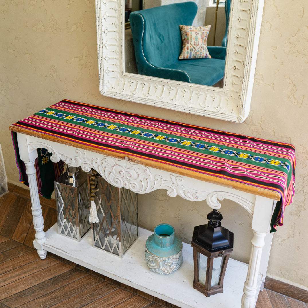 This fun table runner combines majdalawi fabric in pinks and greens with traditional Palestinian embroidery for a beautiful design.