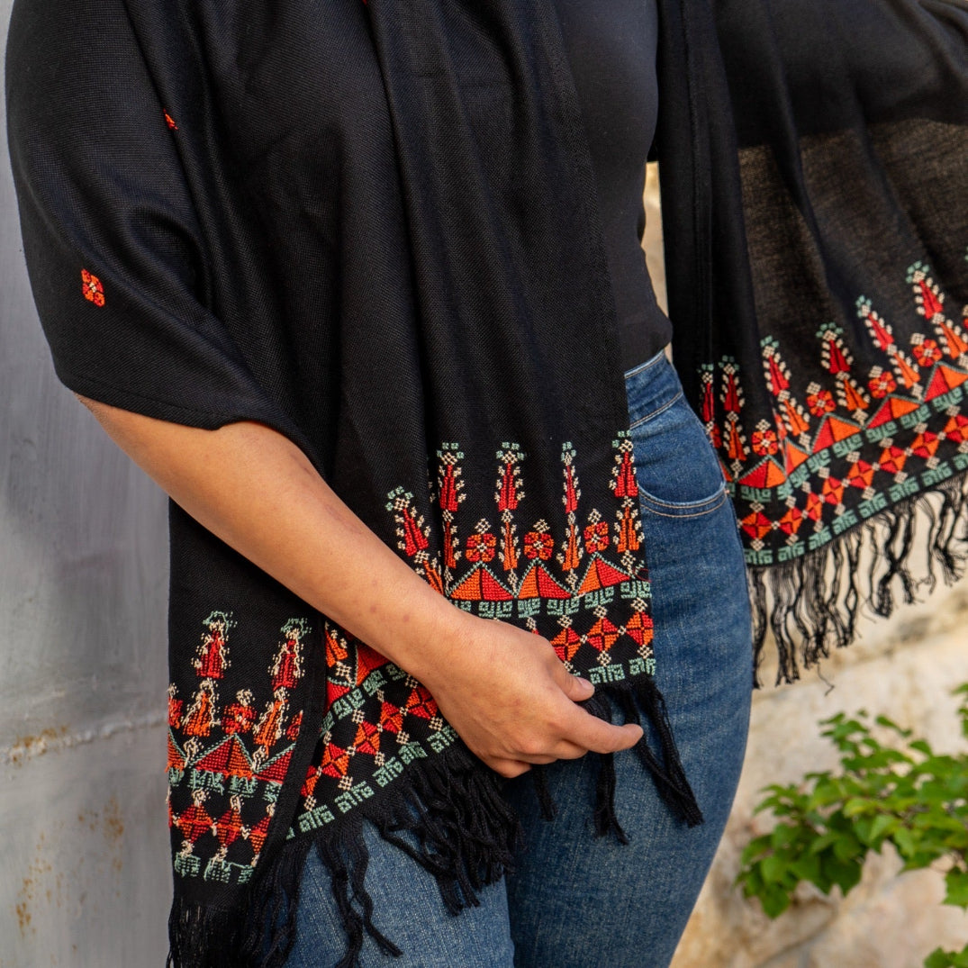 This beautiful shawl from Palestine is hand stitched by women and features traditional Palestinian embroidery in orange and blues on a black fabric. The tatreez is from a traditional craft practiced by women in Palestinian villages working from home and is a skill passed on, the craft of traditional Palestinian tatreez.