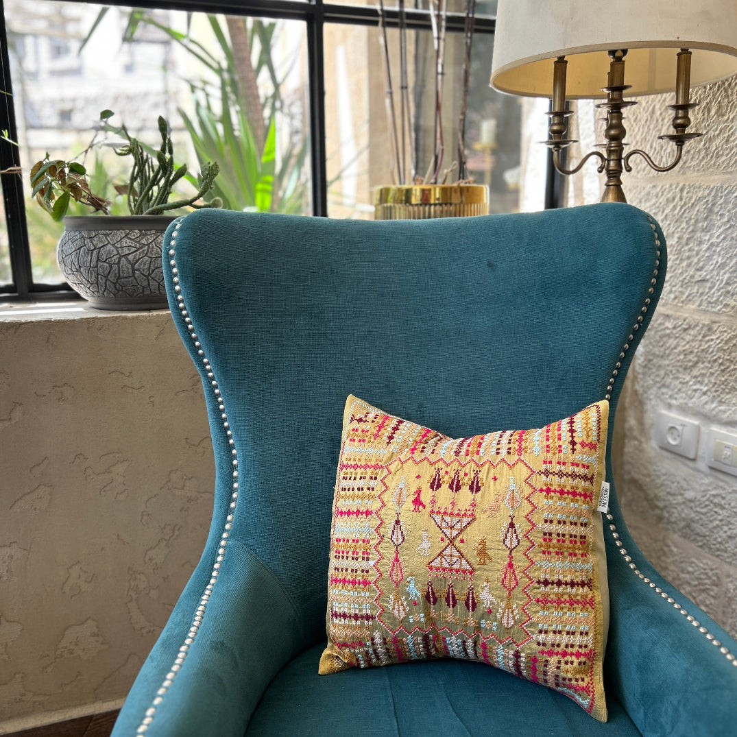 This gorgeous cushion cover is inspired by antique Palestinian tatreez cushion covers. The fabric is as stunning as the hand embroidered design! Embroidery on one side.