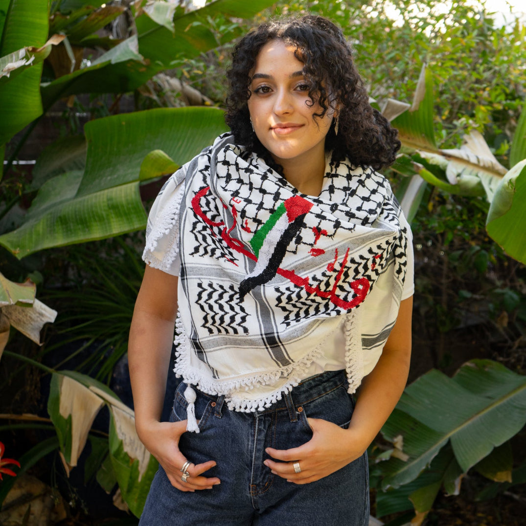 Palestinian woman wearing a Palestinian flag tatreez keffiyeh in a natural setting