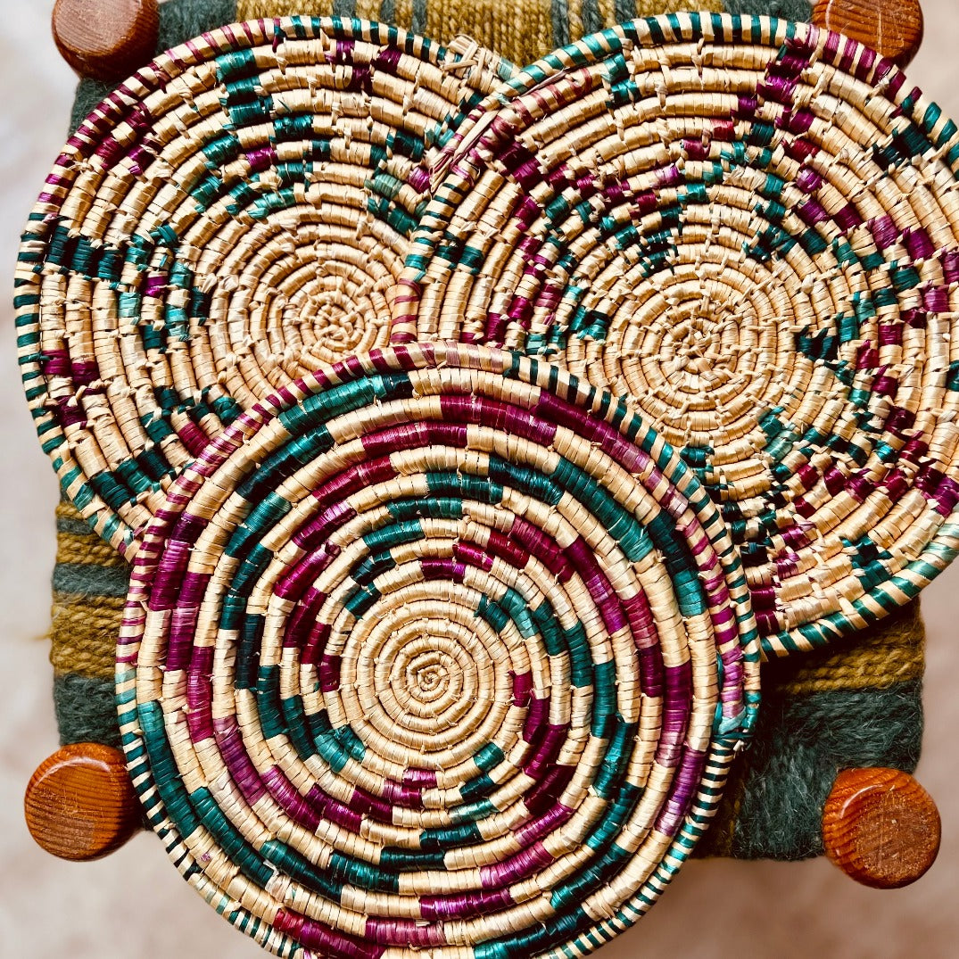 A traditional craft, weaving baskets and saniye (plates) from wheat and even olive branches is a dying art in Palestine. Om Yusef not only weaves traditional pieces, she grows her own wheat and dyes it herself. These are beautifully woven and the colors are stunning. We invite you to hang it on the wall as decor or use it for fruits on the counter.