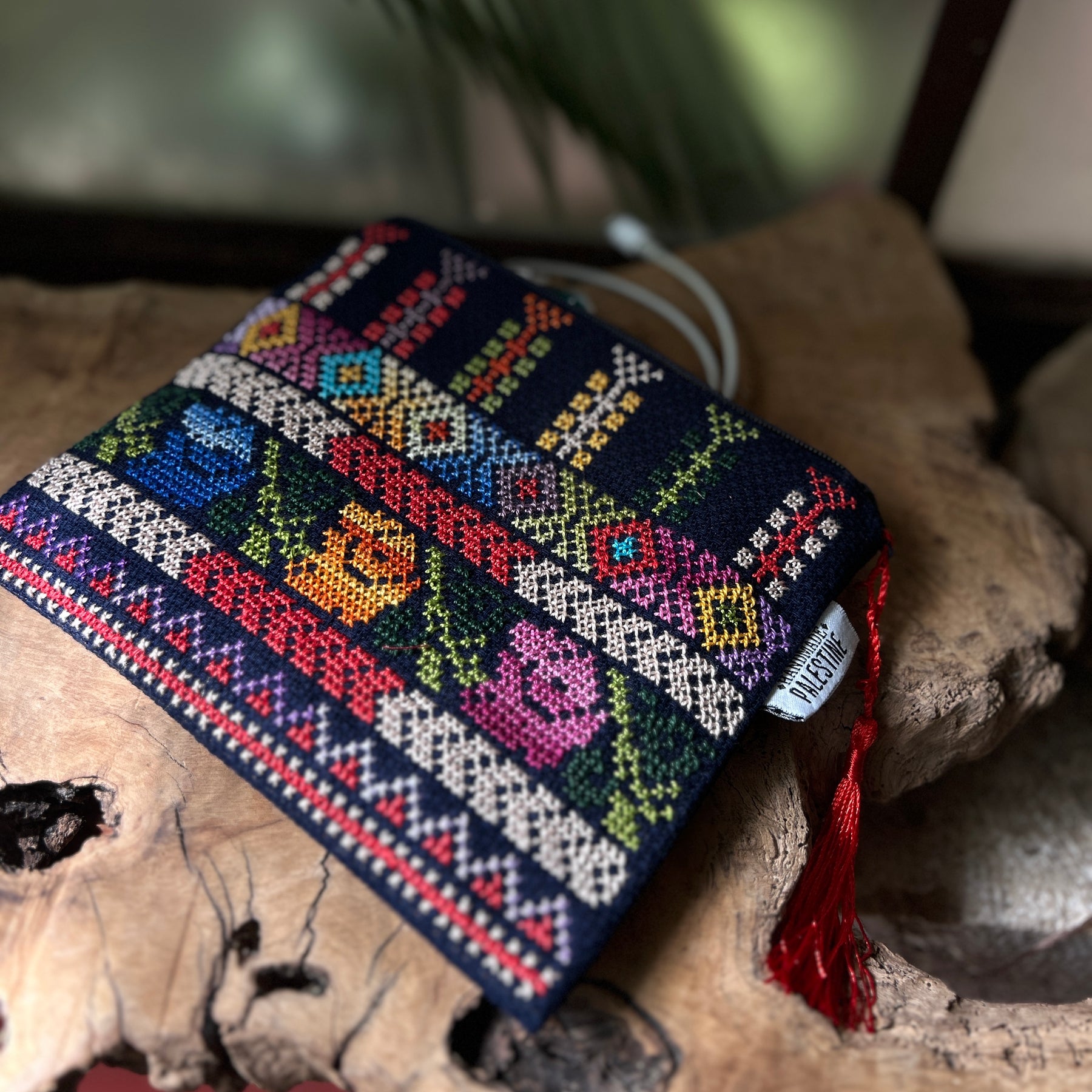 This wonderful large pouch design is inspired by traditional Palestinian fallahi thob designs. Embroidery on one side.