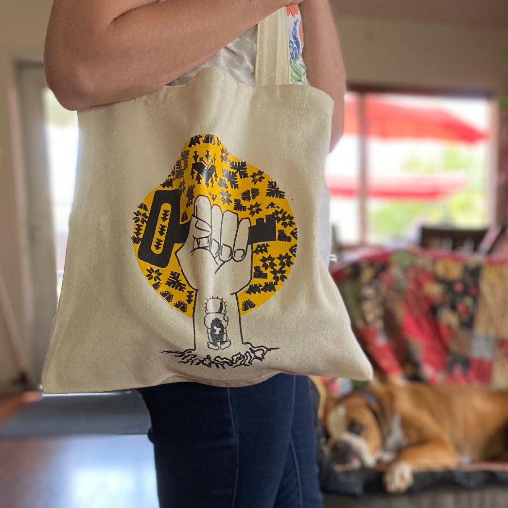This Palestinian tote bag features a powerful Key of Return design with Handala at its base, framed by traditional tatreez embroidery patterns.  Made from locally sourced fabric in Hebron and printed in Dheisha Refugee Camp, it serves as both a meaningful symbol of heritage and a practical everyday accessory.