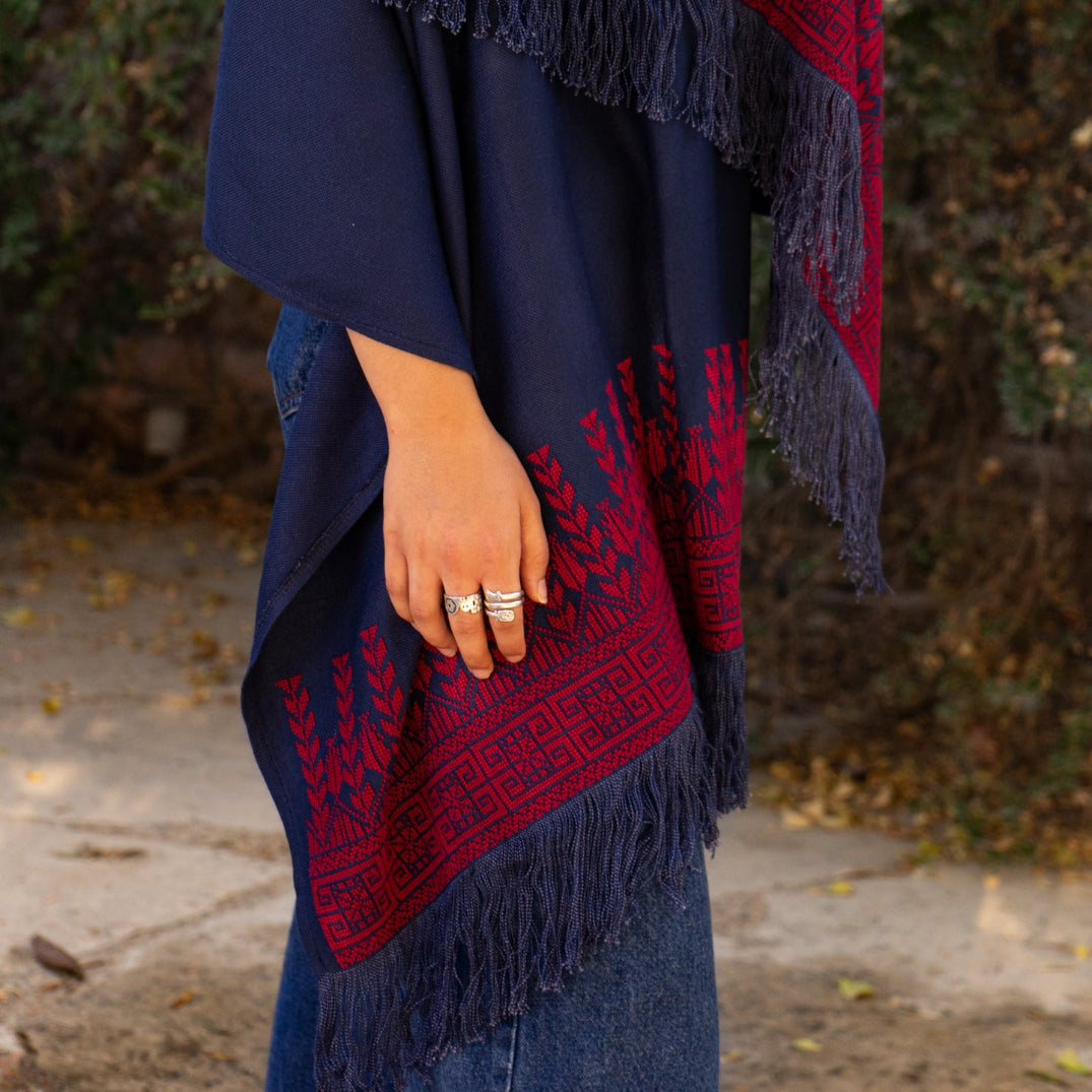 This stunning hand stitched shawl features traditional Palestinian embroidery in red on a soft, elegant navy-blue fabric. The tatreez is from women in Palestinian villages working from home is a skill passed on, the craft of traditional Palestinian tatreez.