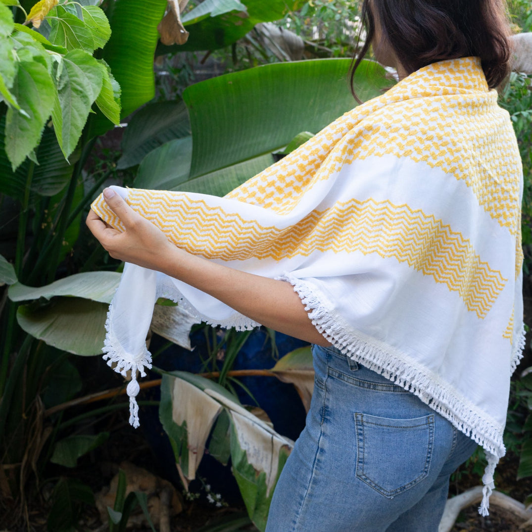 This Palestinian keffiyeh features yellow thread embroidered on white fabric. The intricate patterns woven throughout symbolize strength, resilience, and cultural identity. The keffiyeh is lightweight and versatile, making it suitable for both casual wear and as a meaningful statement piece. It can be styled in various ways - wrapped around the neck, draped over the shoulders, or worn on the head. The blend of colors and traditional patterns makes this keffiyeh a striking accessory, perfect for expressing both cultural pride and contemporary fashion.