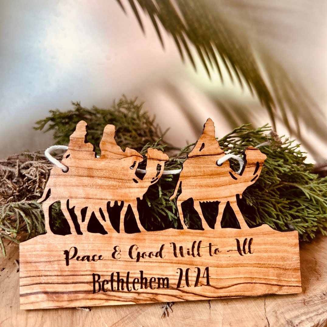 This original design of 3 wisemen lasered on olive wood was crafted in Bethlehem, Palestine, by traditional olive wood craftsman. It says "Peace & Good Will to All" and below it "Bethlehem 2024." The ornaments come on natural string and were packed for you by folks with special needs so we could help them generate income too!